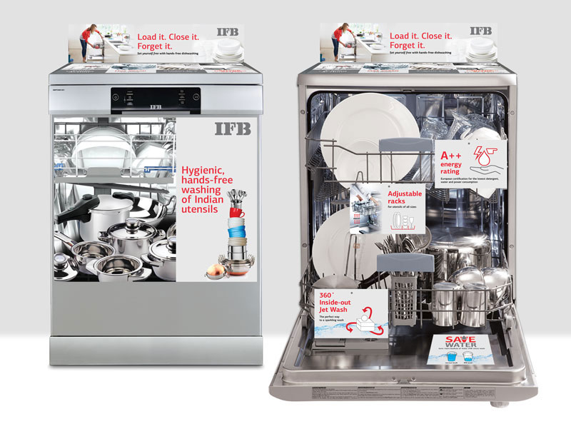 The communication for IFB Dishwashers highlights the benefits of owning the product such as user convenience, zero breakages, water saving etc.