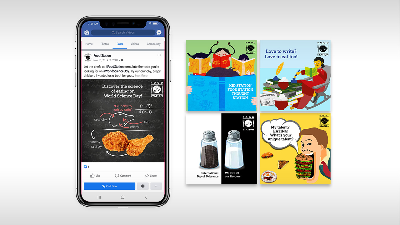 Located on Kolkata's famed College Street, Food Station is an eatery that offers snacks and meals to a vast number of graduates and undergraduates, amongst others. Our communication for it centres around a conversational tone for millennials.